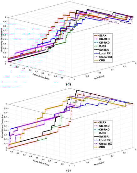 3D ROC curves of the anomaly detection algorithms: (a) Real RIT dataset; (b) Real San Diego dataset; (c) Real Viareggio dataset; (d) Implanted RIT dataset; and, (e) Destructed RIT dataset.