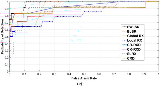 2-D ROC (PD, PF) of the anomaly detection algorithms: (a) Real RIT dataset; (b) Real San Diego dataset; (c) Real Viareggio dataset; (d) Implanted RIT dataset; and, (e) Destructed RIT dataset.