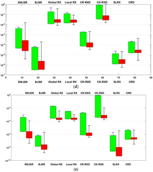 Target-background separation diagram of the anomaly detection algorithms (the green box shows the target and the red box shows background statistics): (a) real RIT dataset; (b) real San Diego dataset; (c) real Viareggio dataset; (d) implanted RIT dataset; and, (e) destructed RIT dataset.