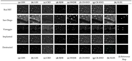 Detection maps of compared algorithms for all datasets: (a) GRX detection map; (b) LRX detection map; (c) CRD detection map; (d) Background Joint Sparse Representation (BJSR) detection map; (e) SWJSR detection map; (f) CR-RXD detection map; (g) CK-RXD detection map. (h) SLRX detection map; and, (i) Reference anomaly map.