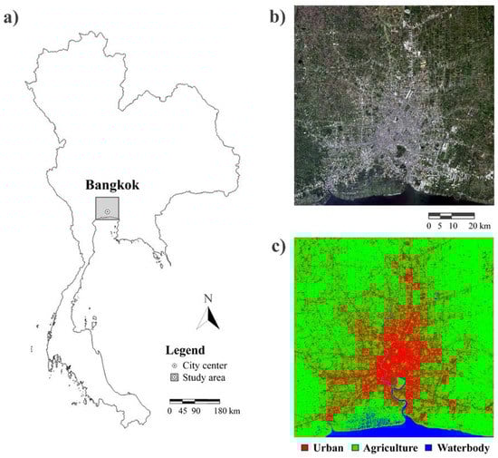(a) Bangkok (city center coordinates: latitude 13.83°N, longitude 100.54°E) inside the Thailand administrative borders. (b) Bangkok area from Landsat 8 RGB image of 17 November 2014. (c) Land Use and Land Cover (LULC) map of Bangkok obtained from Landsat 8 data (see Section 3.2).