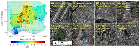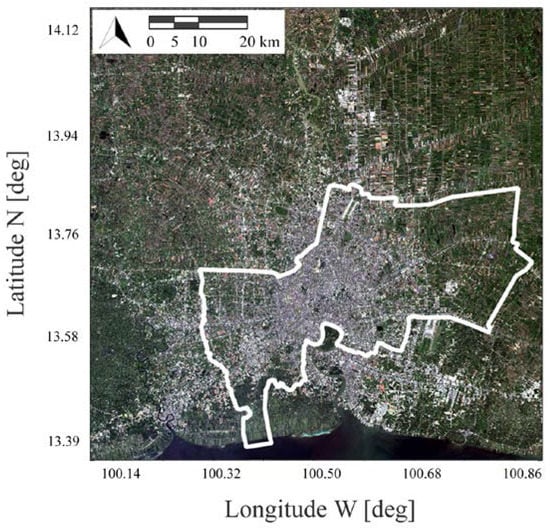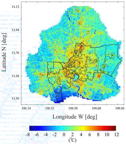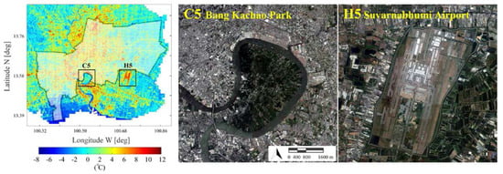 From literature, the urban heat island studies in Bangkok are limited: UHI intensity investigations were carried out with in situ weather stations measuring air temperature [23,24,25], while satellite maps from MODerate-resolution Imaging Spectroradiometer (MODIS), with a spatial resolution of 1 km, were processed from September 2001 to March 2002 to quantify the SUHI [26]. Therefore, this study also represents a SUHI insight of the megacity at higher spatial resolution.