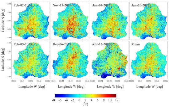 First, an overview of the SUHI pattern of the whole urban area of Bangkok is provided. Figure 4 shows the seven SUHI maps obtained from the satellite passages of Table 1; the last panel represents the mean SUHI of the seven maps.