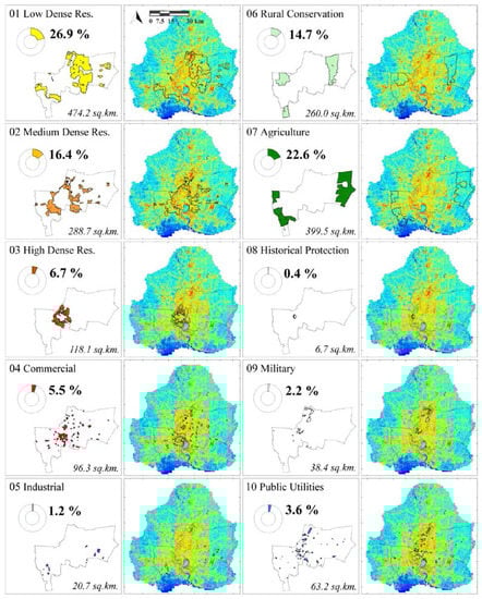 To better describe the SUHI pattern of each land use zone, a representation of the ten categories is reported in Figure 6. This figure depicts the layout of each category, its spatial extent and correspondent percentage within the whole plan, together with the superimposition on the mean SUHI map. Such representation allows to better identify the surface heating pattern of the different zones and to compute their SUHI statistics.