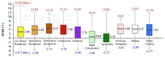 The same is true for the Commercial and Industrial classes: Commercial category, with higher mean SUHI (4 °C), is scattered in the whole plan area but with a quite evident concentration in the city center, whilst the Industrial zone, with a lower mean intensity (2.7 °C), is confined in the Bangkok outskirts. The benefit of some spotted green zones in the Industrial category is also confirmed by the lower minimum value (−5.5 °C). The Public Utilities/Government Institute class has a SUHI dynamic like the Commercial one, both having a quite similar spatial scattering.