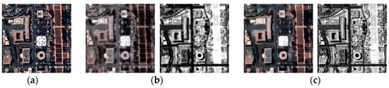 In [29], the spatial details of each band of the HS image are extracted by average filtering. The right picture of Figure 3b shows the detail map obtained by average filtering. The right picture of Figure 3c shows the detail map obtained by the adopted IID technique. The detail map shown in Figure 3b contains part of the spatial information of the HS image. The detail map obtained by the IID technique contains most of the spatial information of the HS image. The IID is indeed an effective technique for extracting spatial information of the HS image.