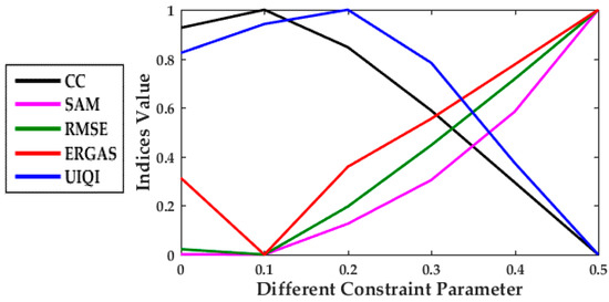 In the experiments, is the parameter which determines the quantity of the final injected spatial details and influences the fusion performance directly. To select an optimal parameter , the proposed method is performed on the Salinas dataset with different settings. We apply five quality measures to investigate the effects of the parameter on the fusion performance. For clarity, the five quality measures are normalized to [0, 1] by the min-max normalization method and are displayed in one figure. Figure 4 shows the performance of the proposed method with different settings. It can be observed that the CC and UIQI values are increasing from 0 to 0.1 when is increased from 0 to 0.1. The CC value obtains the biggest value when equals to 0.1. In addition, the values of SAM, RMSE, and ERGAS all are decreasing when is increased from 0 to 0.1. While they will increase when equals to 0.1. Therefore, we can draw a conclusion that when , the performance of the proposed method is the best. We have also performed the performance of the proposed method on various hyperspectral remote sensing images. We found that also give the best performance there. Therefore, the parameter is set as 0.1 in this paper.