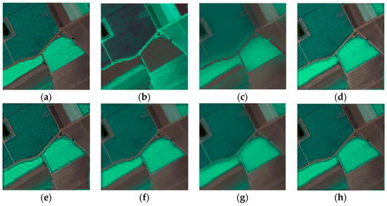 Visual comparison of different hyperspectral pansharpening methods for Salinas dataset. (a)Reference; (b) PCA; (c) GFPCA; (d) HySure; (e) MGH; (f) CNMF; (g) Sparse Representation; (h) Proposed.