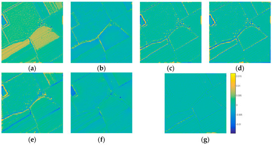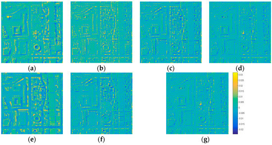 Visual comparison of difference images (light blue means small differences) between each fused HS image and the reference HS image (Salinas dataset). (a) PCA; (b) GFPCA; (c) HySure; (d) MGH; (e) CNMF; (f) Sparse Representation; (g) Proposed.