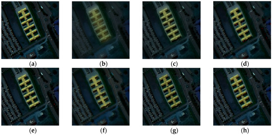 Figure 9 shows the visual comparison of the fused images obtained by different fusion methods for the Washington DC dataset. The reference HS image is displayed in Figure 9a. Figure 9b–h show the fused images obtained by different fusion methods. It is apparent that the fused image obtained by the PCA method suffers from the spectral and spatial distortion. The fused image obtained by the GFPCA method shows improvement, but the spatial quality is not improved obviously. A visual comparison shows that the MGH method performs well in spectral aspect, but the fused image obtained by the MGH method looks blurry in some areas. The reason is that the injected spatial details is insufficient. The CNMF and Sparse Representation methods are close to the reference image in spectral aspect. However, the spatial quality of the CNMF and Sparse Representation methods in the edge regions is not desired. The fused results obtained by the HySure and the proposed fusion methods have superior performance in spectral and spatial aspects.
