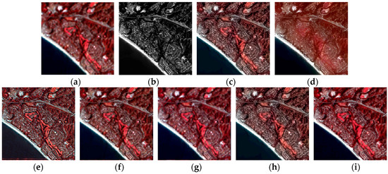 Visual comparison of different hyperspectral pan-sharpening methods for Hyperion dataset. (a) Interpolated HS image; (b) P image; (c) PCA; (d) GFPCA; (e) HySure; (f) MGH; (g) CNMF; (h) Sparse Representation; (i) Proposed.