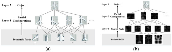 PCM consists of two layers. The first layer is the partial configuration layer, and the second layer is the object layer. There is also a hidden layer in PCM, the semantic part layer, which is the basis of the first layer. The architecture of PCM is given in Figure 4a. The number of subjects/items in the first layer is much greater than other layers. As revealed above, the main body of all training or detection work is involved in the partial configuration layer, and the semantic part layer is only for the purpose of data preparation. This leads to a situation where a large number of subjects need to be trained or detected for the first layer. Although the elements in the partial configuration layer are based on the same basis layer, they do not share the basis during the training and detection, that is, the entire basis layer is separately trained or detected for each partial configuration. We believe that this is where these shortcomings in PCM come from.