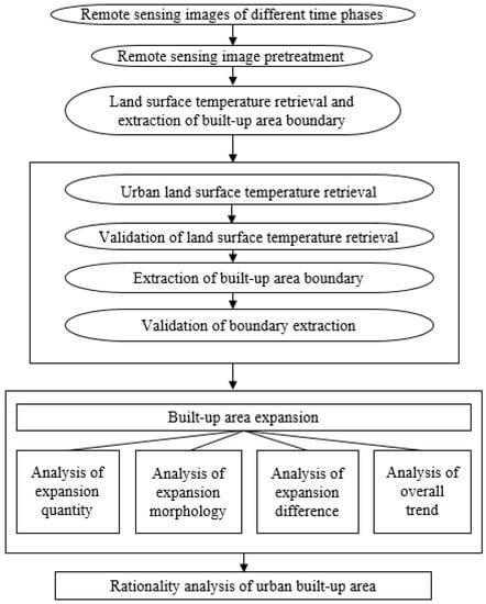 The basic principle was to use the Landsat TM/ETM+/OLI_TIRS images to extract the boundaries of urban built-up areas in different periods. Then, the temporal-spatial characteristics of urban built-up area expansion of Jingzhou in the past 15 years were analyzed. The conceptual and theoretical framework of the study is shown in Figure 2.