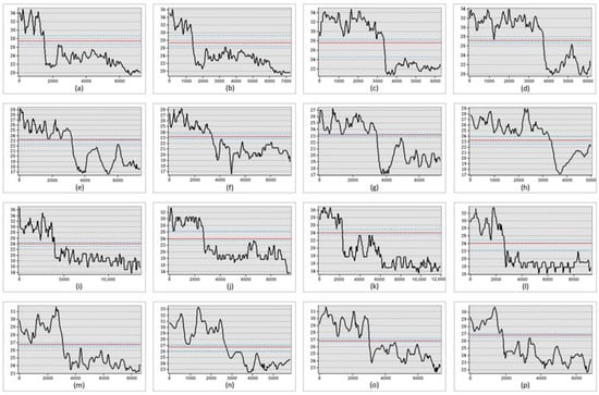 (a–d) are the profile graphs of interpolated lines in 1999; (e–h) are the profile graphs of interpolated lines in 2004; (i–l) are the profile graphs of interpolated lines in 2010; (m–p) are the profile graphs of interpolated lines in 2014. The blue lines are the temperature threshold’s range of the urban built-up area boundary, and the red lines are temperature thresholds of the urban built-up boundary.