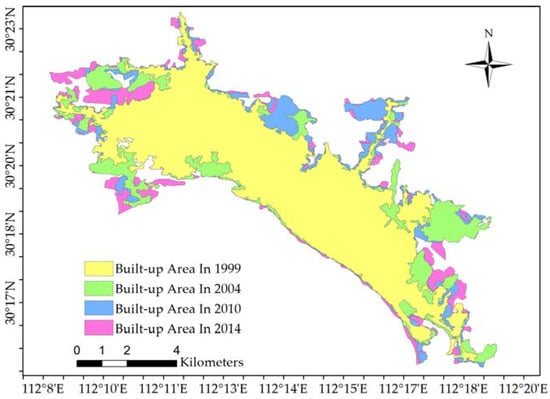 The built-up area boundaries were extracted from the pretreated remote sensing images of the four time phases, along with the size of the built-up areas during each year. First, GIS was used for superposition of the images, and the distribution of the built-up area expansion in the Jingzhou and Shashi District of Jingzhou City was analyzed. Figure 7 shows the processed map, which indicates a constant increase of the scale of the built-up areas in both the Jingzhou and Shashi District of Jingzhou City from 1999–2014. The built-up area of 1999 is used as the center for both districts, though the intensity of expansion varies in different directions, and the expansion is most intensive in the axial direction.