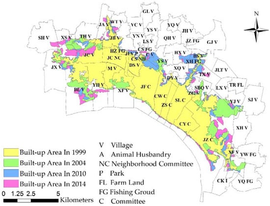 In 1999, the built-up area in Jingzhou City was 50.243 km2, and all of the area was distributed between the Jingcheng District, Chongwen District community (CW C), Zhongshan Road community (ZS C), Shengli Road community (SL L), Chaoyang road community (CY C), and Jingzhou Development Zone. In 2004, the built-up area of Jingzhou had increased 11.035 km2 from 1999 to 61.278 km2. In the Jingzhou District, the northward expansion towards the Xinsheng Village (XS V), Taihui Village (TH V) and Jing’an Village (JA V) makes the greatest contribution. For the Shashi District, the built-up area expansion is mainly contributed by the northward, east-northward and south-eastward expansion of Jingzhou Development Zone. In 2010, the built-up area in Jingzhou had increased 5.264 km2 from 2004 to 66.542 km2. The new built-up areas in the Jingzhou District appeared in the periphery of the built-up areas of 2004. They were mainly concentrated in the Jingcheng Village (JC V), Xinsheng Village (XS V), Taihui Village (TH V) and Bailong Village (BL V). In addition to further enlargement of Jingzhou Development Zone, the expansion from Jiefang Road Community (JF C) to the Sanbanqiao Village (SBQ) and from the Shengli Road community (SL C) to the Tongxin (TX V) and Baishuo (BS V) villages made the greatest contribution for the Shashi District. In 2014, the built-up area of Jingzhou reached up to 73.898 km2. From 2010–2014, the new built-up areas in Jingzhou District were mainly concentrated in the Jingcheng Village (JC V), Xinsheng Village (XS V), Taihui Village (TH V), Bailong Village (BL V) and Sanhong Village (SH V). The new built-up areas in the Shashi District were mainly concentrated in the Jingzhou Development Zone, with a mild expansion from the Shengli Road community (SL C) to the Tongxin Village (TX V).