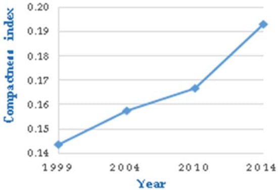 In the equation, J is the compact degree of urban built-up area, S is the area of urban built-up area and Z is the perimeter of urban built-up area. If the shape of the urban built-up area is close to circular, the compact index will be close to one, and the urban space is more compact. On the contrary, if the compact index is far from one, the urban space is less compact. As shown in Table 8 and Figure 8, from 1999–2014, the compactness index of the built-up area remains low, but a gradual increasing trend is shown. Therefore, the morphology becomes simpler as the urban spatial compactness increases.