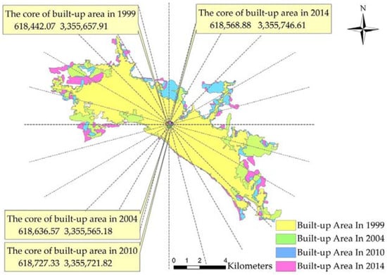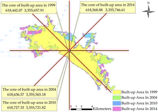 The barycenter index can be used to describe urban spatial distribution. The barycenter of the built-up area is the equilibrium point of the city’s uniform distribution. It can be obtained by computing weighted average of the geometric center coordinates of each urban plot. Using the GIS software, we calculated the coordinates of the barycenter for each year based on the geometric shape of the built-up area (see the Figure 10). The map portrays the location of the barycenter of the built-up area. In Figure 10, we observe that the barycenter of the built-up area barely shifts from 1999–2014. This means that spatial extension is the primary form of urban expansion in Jingzhou.