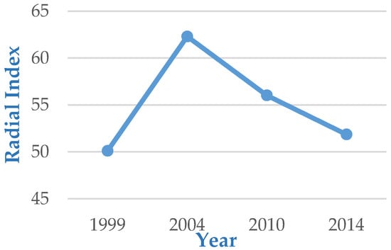 The radial index, also known as the Boyce–Clark shape index, was first proposed by Boyce and Clark []. By using each year’s barycenter of the built-up area as the core, 24 radial lines are drawn from the core. The inclusion angle between the two adjacent lines is 15° (Figure 11). As shown in Figure 12, the radial indices of the built-up area from 1999–2014 were calculated. It is found that the radial index is generally high, indicating spatial form irregularity of Jingzhou’s built-up area. The radial index increases from 1999–2004, indicating the growing spatial form irregularity. After 2004, the radial index consistently decreases, indicating the increasing spatial form regularity of Jingzhou’s built-up area.