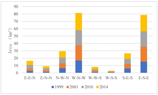 Built-up area’s spatial expansion in eight directions in different periods (unit: km2).