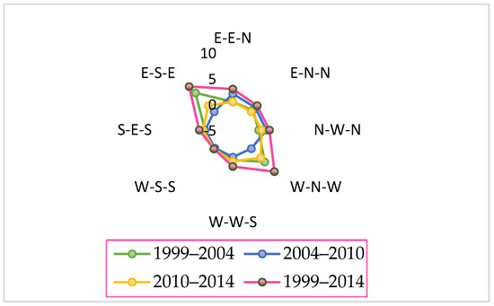 According to Table 10 and Figure 15, the expansion is fastest in the east-south-east direction from 1999–2004, followed by that in the west-north-west direction. From 2004–2010, the expansion is the fastest in the east-east-north direction, followed by that in the east-north-north direction. The expansion rate first decreases, then increases, and slows down from 2004–2010. The standard deviation is the smallest from 2004–2010, indicating the smallest difference in the expansion rate of the built-up area in the eight directions. In the last column, the total expansion quantity is the highest in the east-south-east direction from 1999–2014, and it is the lowest in the west-south-south direction.