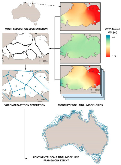 Conceptual diagram showing the development of the tidal modelling framework: twelve tidal height layers were generated from the OTPS TPX08 model at monthly epochs across 2016. These layers were processed using a multi-resolution segmentation, from which a Voronoi partition is generated using the centroids of the segments.