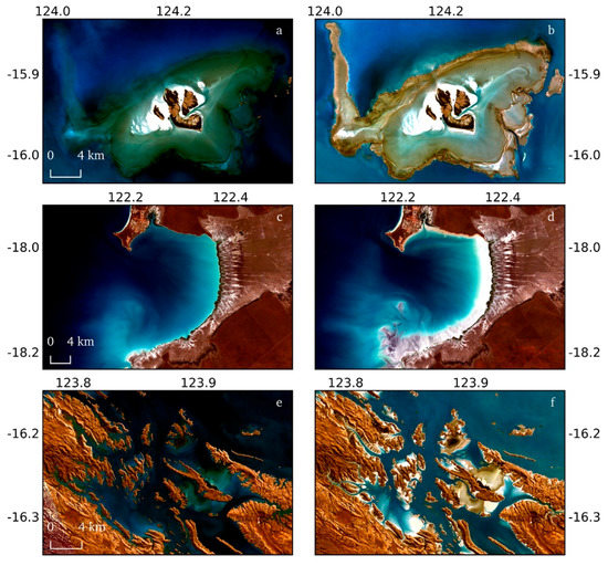 High and low tide composite products: pixel-based composite geomedian mosaics generated at the highest 20th percentile (a,c,e) and lowest 20th percentile (b,d,f) of the observed tidal range (OTR). Examples shown at Montgomery Reef, Western Australia (a,b); Roebuck Bay, WA (c,d), and Talbot Bay, WA (e,f).