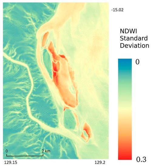 Intertidal extents model (ITEM) confidence layer, Keep River West Bank, Northern Territory: The confidence layer shows the average variation in normalised difference water index NDWI values across each tidal percentile used in the ITEM product. Higher values indicate regions of change between water and land that are not driven by tidal influences [16].