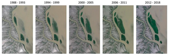 To investigate changes indicated in Figure 5, images of the mid-tide range (40th to 60th percentiles of observed tide heights) were used as inputs to the geomedian composite process, with 6 year epoch time steps defined across the length of the archive. Using the mid-tide range reliably provides a rich dataset from which to select input images, without a dependency on the less frequently occurring observations at the extremes of the tidal range. The time series of 6 year composites for the Keep River (Figure 6) show two processes of natural change occurrence. Firstly, the area is seen to be dynamic in terms of sediment transport with banks both continuously forming and disappearing. Overall, sediment deposition and the development of the observed sand/mud banks appear to be the dominant driver of change in this environment. Secondly, the formation and settlement of these banks has been the catalyst for the progression of vegetation (mangrove) in this part of the river.