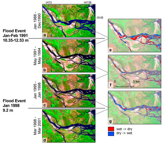 The Burdekin River estuary is a multi-channel system where geomorphic change is evident in the 30 year imagery archive of the DEA. To investigate whether composite imagery can indicate that these changes can be attributed to flooding events, we generated geomedian composites at 3 year time steps either side of flood events in 1991 and 1998 indicated in the gauge record. These composites were constrained to the lowest 20% of the OTR to allow the maximum substratum extent to be exposed across the estuary. A simple land/water classification, identical to that used in [16], was completed on each composite image, utilising the normalised difference water index (NDWI) [33]. Differencing of the land and water extents between subsequent composites was then completed to indicate areas of change from wet to dry and vice versa (Figure 7).