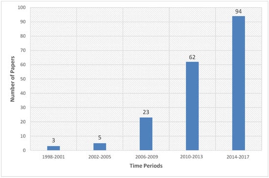 Figure 2 illustrates the dynamics of the important subject of hyperspectral image denoising in the hyperspectral community. The reported numbers include both scientific journal and conference papers on this particular subject using “hyperspectral” and “(denoising, restoration, or noise reduction)” as the main keywords used in the abstracts. In order to highlight the increase in this number, the time period has been split into a number of equal time slots (i.e., 1998–2001, 2002–2005, 2006–2009, 2010–2013, 2014–2017 (October 1st)). The exponential growth in the number of papers reveals the popularity of this subject.