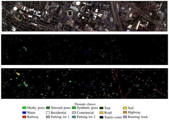 Houston—from top to bottom—a color composite representation of the hyperspectral data using bands 70, 50, and 20, as R, G, and B, respectively; training samples; test samples; and the corresponding color bar.
