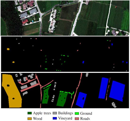 Trento—from top to bottom—a color composite representation of the hyperspectral data using bands 40, 20, and 10, as R, G, and B, respectively; training samples; test samples; and the corresponding color bar.