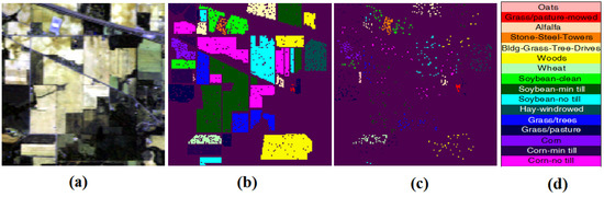 Indian Pines—(a) a color composite representation of the hyperspectral data; (b) test samples; (c) training samples; and (d) the corresponding color bar.