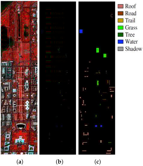This hyperspectral dataset was captured by the Compact Airborne Spectrographic Imager (CASI) over the University of Houston campus and the neighboring urban area in June 2012. This dataset is composed of 144 bands ranging from 0.38 m to 1.05 m and the spatial resolution is 2.5 m. The image contains 349 × 1905 pixels. The available groundtruth covers 15 classes of interest. Table 2 gives information on all 15 classes including the number of training and test samples. Figure 3 shows a three-band false color composite image and its corresponding and already-separated training and test samples.