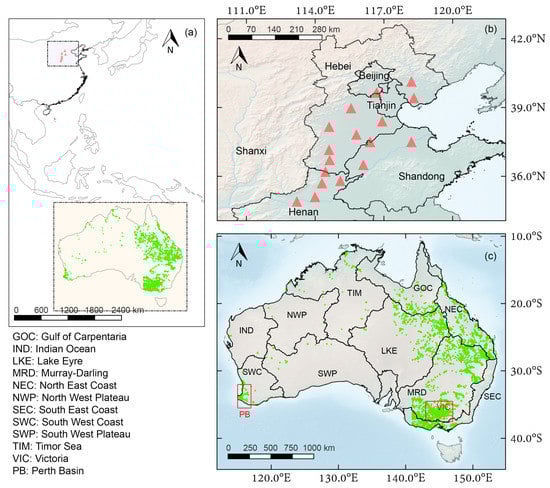 (a) Geographical locations of the study areas; (b) the North China Plain (NCP); and (c) Australia. The groundwater locations (red triangles) in major cities of NCP are shown in (b) while the locations of groundwater observation bores (green dots) in Australia are shown in (c).
