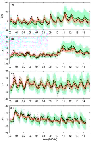 The GRACE data and its error variance-covariance matrices are obtained from the GRACE gravity product release 5 (RL05), generated by the University of Texas at Austin’s Center for Space Research [] between January 2003 and December 2014. The product consists of monthly sets of spherical harmonic coefficients (SHC, ). The TWS and its uncertainty are computed using the SHC up to degree (l) and order (m) 60. For the ΔTWS computation, the GRACE data are processed as follows. Firstly, the degree 1 coefficients provided by [] are restored, and is replaced by the value obtained from []. Secondly, the long-term mean SHC is removed from each monthly product to obtain the SHC variation (). Finally, the destriping and 250 km-radius Gaussian smoothing filters are applied to reduce the high frequency noises [,]. The ΔTWS is then computed as: