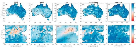 The evaluation of the ΔGWS estimates conducted in this study also reveals the strengths and limitations of the current developed models in different geographical regions. Firstly, CABLE produces an accurate ΔGWS estimate (as accurate as PCR-GLOBWB) in Australia. Similar to the finding of [], the model does not perform well over the area associated with substantial water demand (e.g., VIC, PB, and the NCP) due to the absence of the groundwater withdrawal component. Introducing the anthropogenic factor (as in, e.g., PCR-GLOBWB and WGHM) into the model is feasible to resolve this issue. Including GRACE DA in the model’s development can also be considered according to a noticeable improvement of the ΔGWS estimate, as also seen in earlier studies [,].