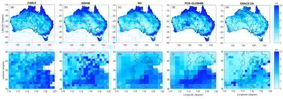 The RMS difference (cm) between the GRACE observation and ΔTWS estimates from four models (CABLE (a,f), WGHM (b,g), W3 (c,h), PCR-GLOBWB (d,i)) and GRACE DA (e,j) in Australia (top row) and NCP (bottom row).