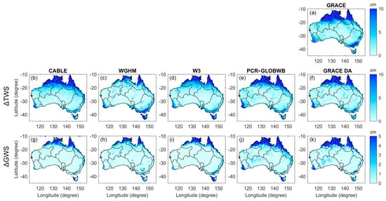 The seasonal amplitude (cm) of the ΔTWS (second row) and ΔGWS (third row) estimates from four models (CABLE (b,g), WGHM (c,h), W3 (d,i), PCR-GLOBWB (e,j)) and GRACE DA (f,k) in Australia. The amplitude of the GRACE observation is also shown (a).