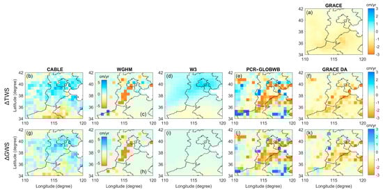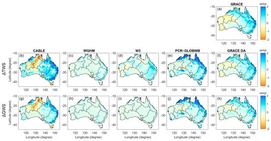 The long-term trend (cm/year) of the ΔTWS (second row) and ΔGWS (third row) estimates from four models (CABLE (b,g), WGHM (c,h), W3 (d,i), PCR-GLOBWB (e,j)) and the GRACE DA (f,k) in Australia. The trend of the GRACE observation is also shown (a).