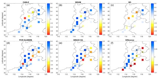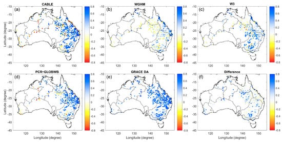 The correlation coefficient between the in situ ΔGL data and the ΔGWS estimate from four models (CABLE (a), WGHM (b), W3 (c), PCR-GLOBWB (d)) and GRACE DA (e) in Australia. The difference between GRACE DA and PCR-GLOBWB (GRACE DA minus PCR-GLOBWB) is also shown (f).