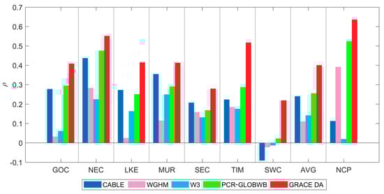 In Australia (Figure 9), all models correlate better with the in situ data in the eastern part of the continent while very low or negative correlation values are observed mostly in the western part (e.g., ρ < 0.02 in SWC). CABLE and PCR-GLOBWB show better agreements with the in situ data compared to WGHM and W3 in all basins. The average correlation values of CABLE and PCR-GLOBWB are 0.24 and 0.26, respectively, which are approximately 0.1 higher than WGHM (ρ ≈ 0.11) and W3 (ρ ≈ 0.14). In terms of correlation, CABLE provides the highest value mostly in the inner part of the continent (e.g., LKE, MRD) while PCR-GLOBWB delivers more accurate ∆GWS in the northern and eastern coastal areas of Australia (e.g., GOC, NEC, TIM). By assimilating the GRACE observation into PCR-GLOBWB, the correlation increases in most basins. Clear increments are seen in the northern part of LKE, the southern part of MRD, and SWC basins (see Figure 9d vs. Figure 9e), and the negative values in the western part of the continent mostly turn to positive. The impact of GRACE DA on the ∆GWS estimate can be seen from the correlation value difference () between the ∆GWS computation with and without GRACE DA (, Figure 9f). The value expresses that GRACE DA provides a greater benefit in the inner and western parts of the continent where the model-data correlation was lower. Overall, GRACE DA improves the ρ values in all Australian basins, not only compared with PCR-GLOBWB, but also compared with the three other models (see Figure 11). On average, GRACE DA increases the value from 0.26 to 0.40 (by ~54%, compared to PCR-GLOBWB).
