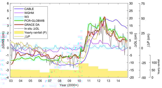 For the modeled ∆GWS, CABLE and PCR-GLOBWB agree with the in situ data with a ρ value ≥ 0.8 (Table 3). WGHM also provides high correlation of ~0.7, but the amplitude is approximately three times smaller than CABLE and PCR-GLOBWB, and the in situ data. W3 fails to simulate a long-term ∆GWS variability; the simulated ∆GWS does not reproduce the ∆GWS rise during the 2010–2011 La Niña periods. The impact of GRACE DA can be summarized in Table 3 showing the basin-averaged ∆GWS time series (Figure 12), which is different from Figure 9, Figure 10 and Figure 11 where the value is calculated at each cell. Assimilating GRACE observation adjusts the ∆GWS estimate to be consistent with the in situ ∆GL data. In particular, the GRACE DA estimate provides the highest correlation value compared to all model simulations in this basin (see Table 3). A similar benefit of GRACE DA on the ∆GWS estimate in MRD can also be found in, e.g., [,,,].