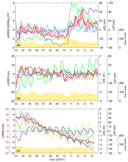 This section investigates the impact of climate variation (long-term rainfall variability) on the groundwater variation. First, the in situ ∆GL data is compared with the precipitation from TRMM data over MRD (Figure 12). To be consistent with the in situ data, only the grid cells with available in situ ∆GL data are used to construct the basin-averaged precipitation time series. The yearly precipitation is computed by accumulating monthly precipitation from January to December. In addition, the integrated monthly precipitation anomaly () is computed to examine how the long-term variation of ∆GL is correlated with the inter-annual variation of the precipitation. From Figure 12, it is clearly seen that the long-term ∆GL is driven mainly by the precipitation variability. For example, the decreased ∆GL between 2003 and 2006 is mainly influenced by the precipitation deficiency during the millennium drought that affects all Australian basins since 2000 [,]. The ∆GL is stabilized in 2007 when the basin receives a greater amount of 2007 rainfall. The ∆GL declines again between 2008 and 2009 caused by the smaller amount of precipitation in the following years. Influenced by the significant recharge from the 2010 to 2011 La Niña rainfall, the ∆GL substantially rises from ca. –9.5 cm in 2009 to ~14 cm in 2012 (by ~2.5 times). The also shows a similar increment signature, by ~2.3 times. After 2012, the precipitation returns to the mean level and no significant recharge supplies to groundwater store between 2013 and 2014. The amount of groundwater is then reduced mainly via the groundwater discharge.