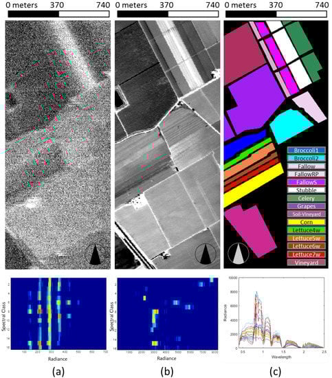To illustrate intuitively how the mutual information works, we report an example in which the objective is identifying the more suitable spectral band in a hyperspectral image to separate different kinds of crops. We analyze a NASA Airborne Visible-Infrared Imaging Spectrometer (AVIRIS) hyperspectral scene containing agricultural fields acquired over the Salinas Valley in the USA. The image has a size of  pixels with 192 spectral bands in the range from 0.288 to 2.5 μm, and with a Ground Sampling Distance (GSD) of 3.7 m. The ground truth identifying the different crops in the image is reported in Figure 1c, and is labeled from 0 (unclassified, reported in black) to 16, with a number and a color assigned to each different crop. As expected, band 1 centered at 380 nm is severely affected by noise in Figure 1a due among other effects to strong atmospheric absorption, Rayleigh scattering, and lower overall power in sun’s emissions in the spectral range between ultraviolet and blue light. Band 42 centered at 750 nm in Figure 1b has opposite characteristics, exhibiting therefore a higher SNR. On a first visual inspection, it looks that the band in Figure 1b would be more effective at discriminating the different crops in the area, and this can be verified by analyzing the joint probability distribution for the two spectral bands in the lower part of Figure 1, as follows.