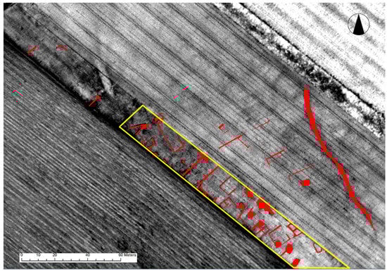 The map reported in Figure 2 has been used as a ground check for the buried structures. The map has been manually derived using as reference the results contained in [], validated by a complete interpretation of aerial archaeological evidence collected in a time span of 50 years []. In order to focus on a meaningful area and decrease variations in the results caused by other kinds of spectral variations, we restrict our analysis to the yellow rectangle overlaid on the image in Figure 2.