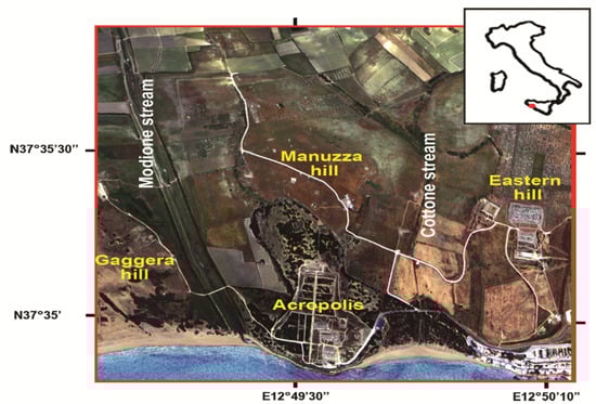 Selinunte is one of the most outstanding cultural heritage sites of Southern Italy, located along the SW coast of Sicily, founded in the 7th century BC by colonizers who came from Megara Hyblaea (ancient Greek colony in Sicily). Selinunte was built over three N-S hills orthogonal to the coastline: moving eastwards, they are the Gaggera, Manuzza and Eastern hills (Figure 3). The public and religious centre of the ancient city (i.e., Acropolis) was located over southern part of Manuzza Hill. The Gaggera and Eastern hills, i.e., two religious areas, were connected to the Acropolis area by a main road, i.e., Plateia, crossing the city area and passing through the urban defence walls. During the two centuries that followed, the city spread eastwards and westwards, along Cottone and Modione stream valleys, which stretch along the borders of Manuzza Hill. The street pattern of Manuzza Hill was first identified on aerophotos by Schmiedt [] and partly confirmed by successive archaeological investigations [].