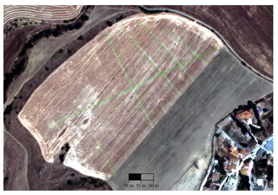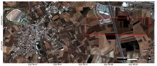 Two different sections of the site have been selected for the particular study: the first area is located where a preceding geophysical study identified the road network at the northern limits of the ancient Greek settlement (green rectangle in Figure 4). The second area was located to the south-east, where visual inspection of the panchromatic image has given some suggestion for the existence of additional ancient streets (red rectangle in Figure 4).