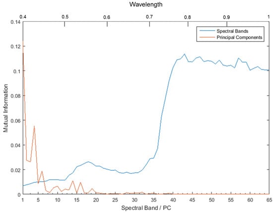 Mutual information between known buried sites and single spectral bands and principal components. A higher mutual information value indicates a better discrimination of the archaeological features of interest. For single spectral bands, this increases in the NIR region with respect to the visible spectral range. The top x-axis reports the wavelength for each band and refers to the blue plot only. See some examples in Figure 6.